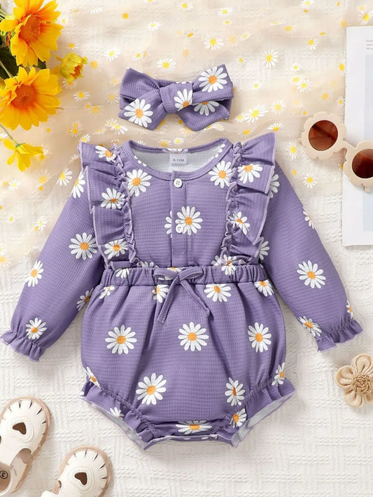 Children's Ruffled Round Neck Floral Romper with Headband